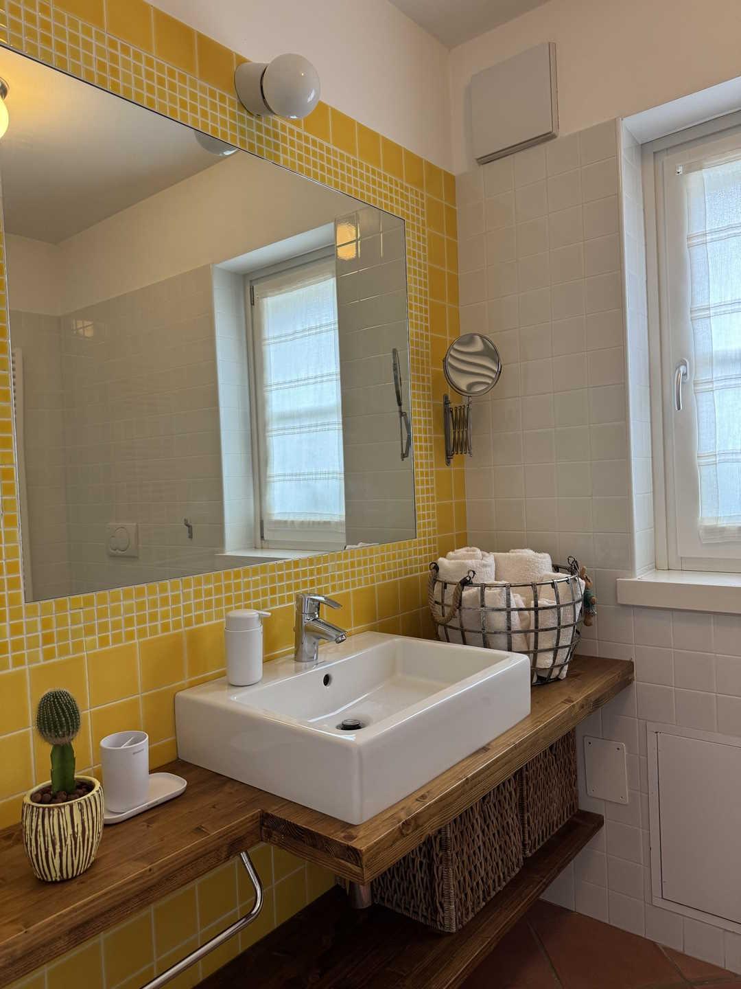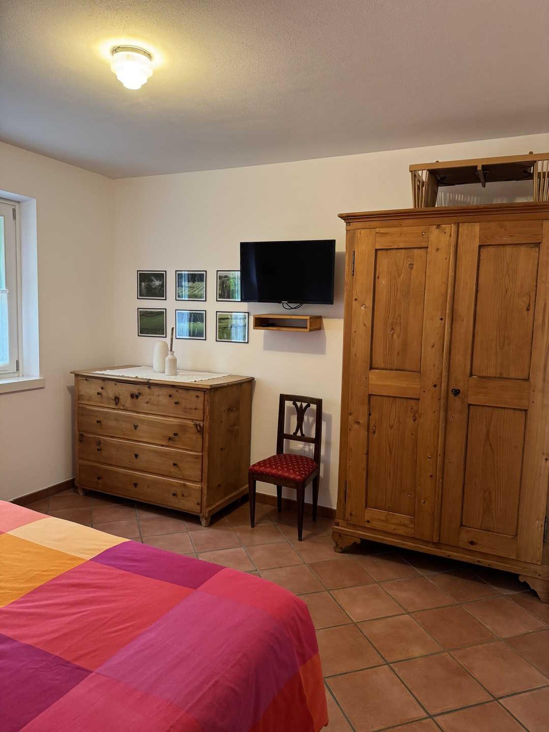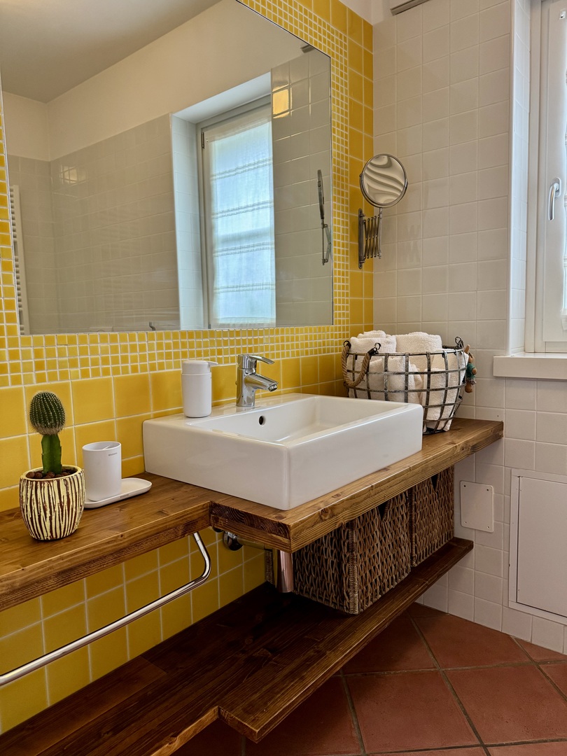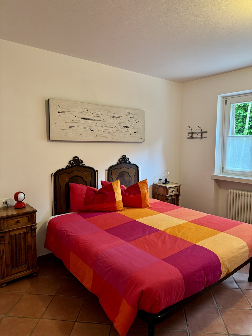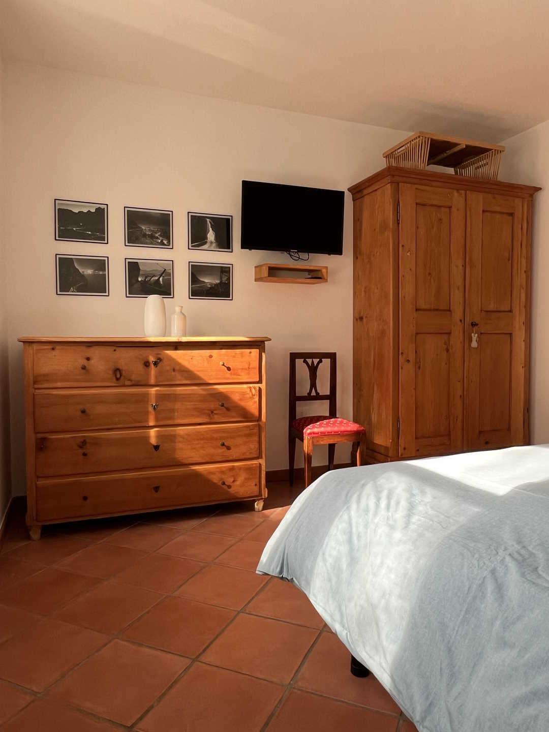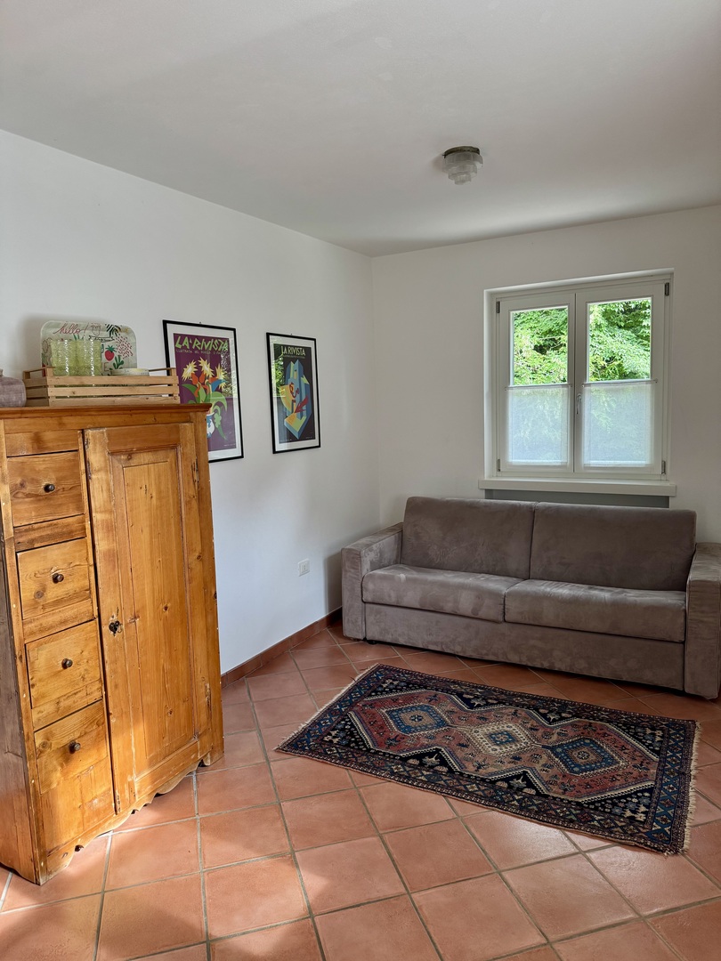 Il bilocale dispone inoltre di un'ampia terrazza ombreggiata, ideale per splendide colazioni all'aperto, dalla quale lo sguardo spazia sul bellissimo territorio collinare e montuoso circostante per estendersi a tutto il Lago di Garda.
